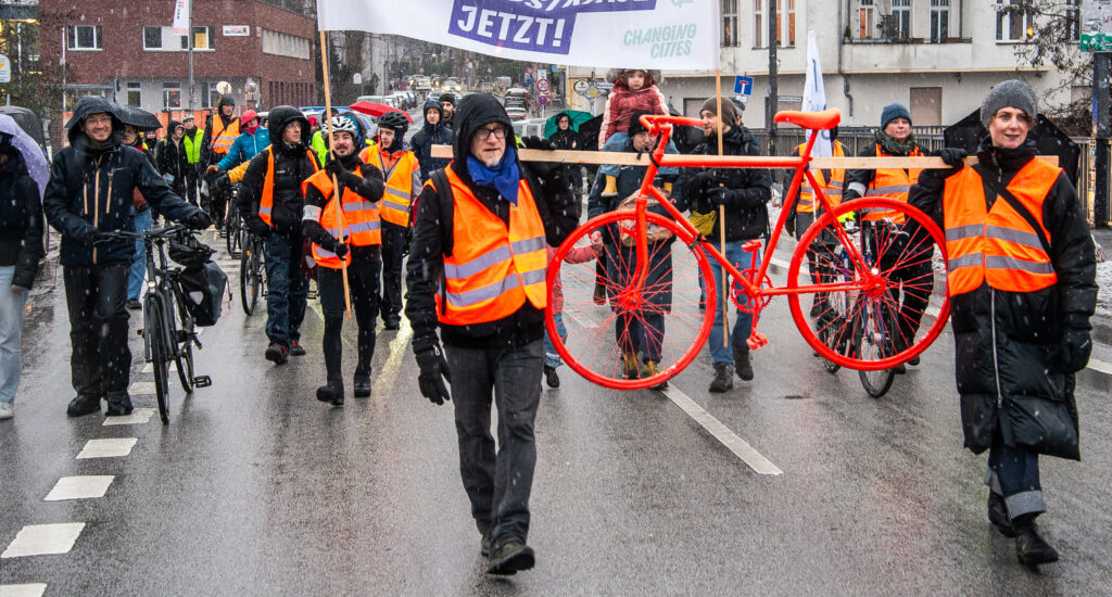 Jetzt reichts. Am Freitag, dem 27.3.2026 machen wir eine Demo für die seit 15 Jahren geplanten Radwege an der Schöneberger Straße. Bei der Laufdemo werden wir feierlich ein knallrot lackiertes „Ermahnrad“ die Strasse entlangtragen und schliesslich an seinem Bestimmungsort aufstellen. Letztes Jahr haben wir das schon in der Monumentenstraße gemacht, siehe Foto.