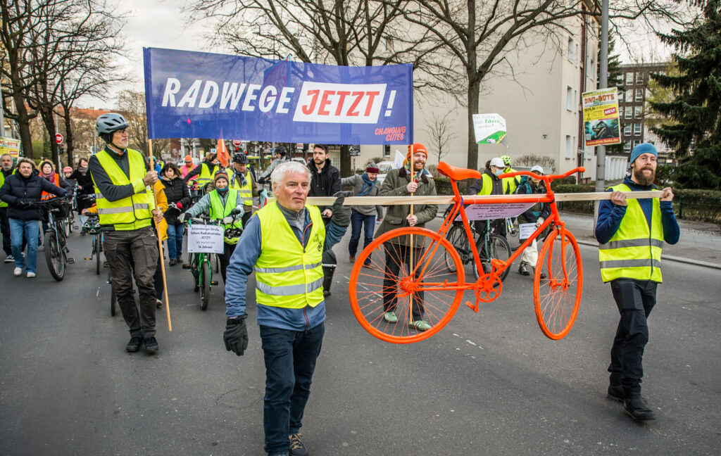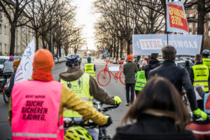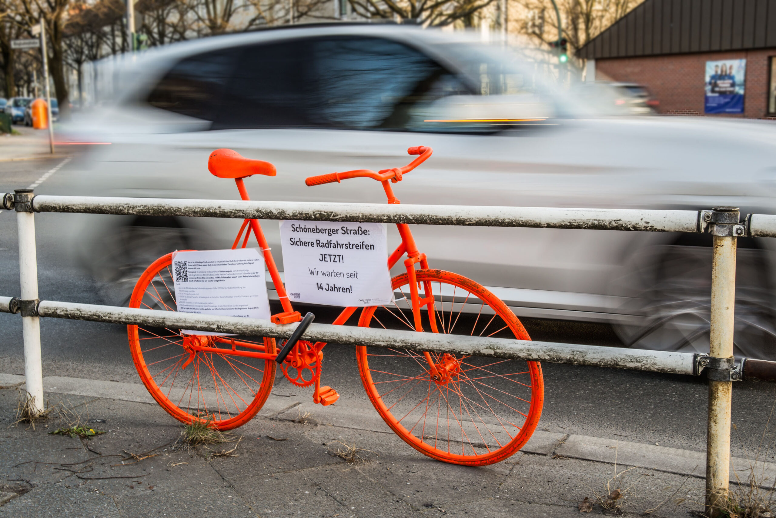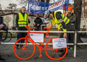 Jetzt reichts. Am Freitag, dem 27.3.2026 machen wir eine Demo für die seit 14 Jahren geplanten Radwege an der Schöneberger Straße. Bei der Laufdemo werden wir feierlich ein knallrot lackiertes „Ermahnrad“ die Strasse entlangtragen und schliesslich an seinem Bestimmungsort aufstellen. Letztes Jahr haben wir das schon in der Monumentenstraße gemacht.