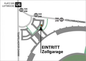 Genauer Ort: Zollgarage im ehemaligen Zentralflughafen Tempelhof, 12101 Berlin, Bauteil F2 – Zugang über den „Ehrenhof“, links vom Haupteingang „Zentralflughafen“